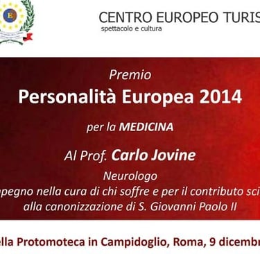 Il Premio “Personalità Europea 2014” per la Medicina è andato al prof. Carlo Jovine, Primario Neurologo dell’Ospedale San Giovanni Battista dell’Ordine di Malta, con la seguente motivazione: “Per l’impegno nella cura di chi soffre e per il contributo scientifico alla canonizzazione di S. Giovanni Paolo II”.