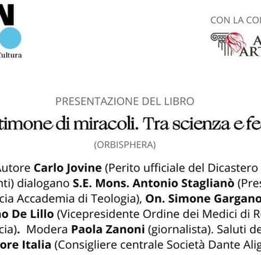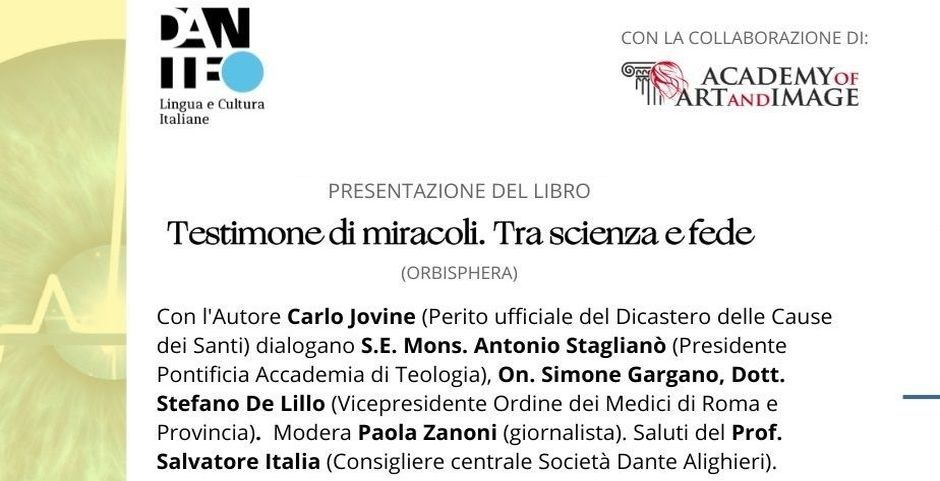 Mercoledì 7 giugno 2023, alle ore 17:00, sarà presentato a Roma il libro “Testimone di miracoli. Tra Scienza e Fede”, scritto dal Prof. Carlo Jovine.